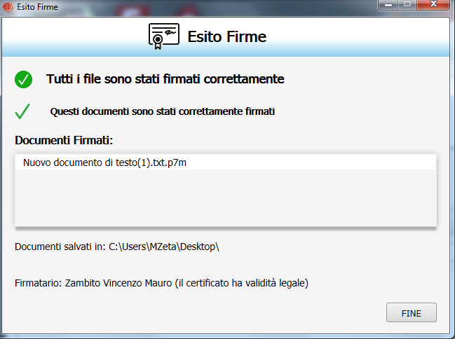 Appena inserito il PIN composto da 8 numeri, verrà abilitato il pulsante Firma. Cliccandolo ed attendendo pochi secondi il processo di firma dei file sarà completato come mostrato nell’immagine seguente: